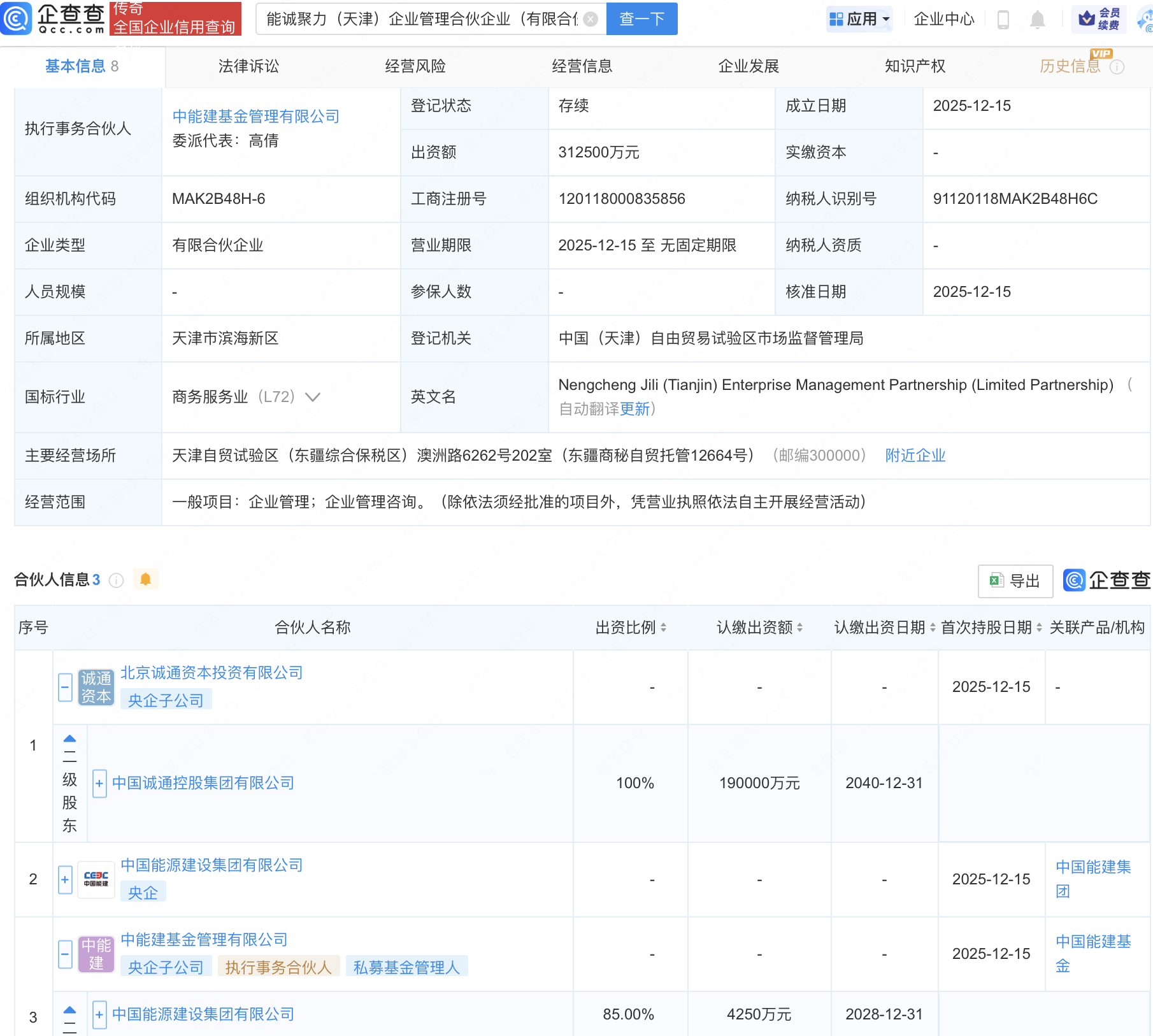 近日,能诚聚力(天津)企业管理合伙企业(有限合伙)成立,出资额31.25亿元股票配资公司倍杠杆,经营范围包含:企业管理;企业管理咨询。企查查股权穿透显示,该企业由中国诚通控股集团有限公司全资子公司北京诚通资本投资有限公司、中国能源建设集团有限公司及其旗下中能建基金管理有限公司共同出资。
